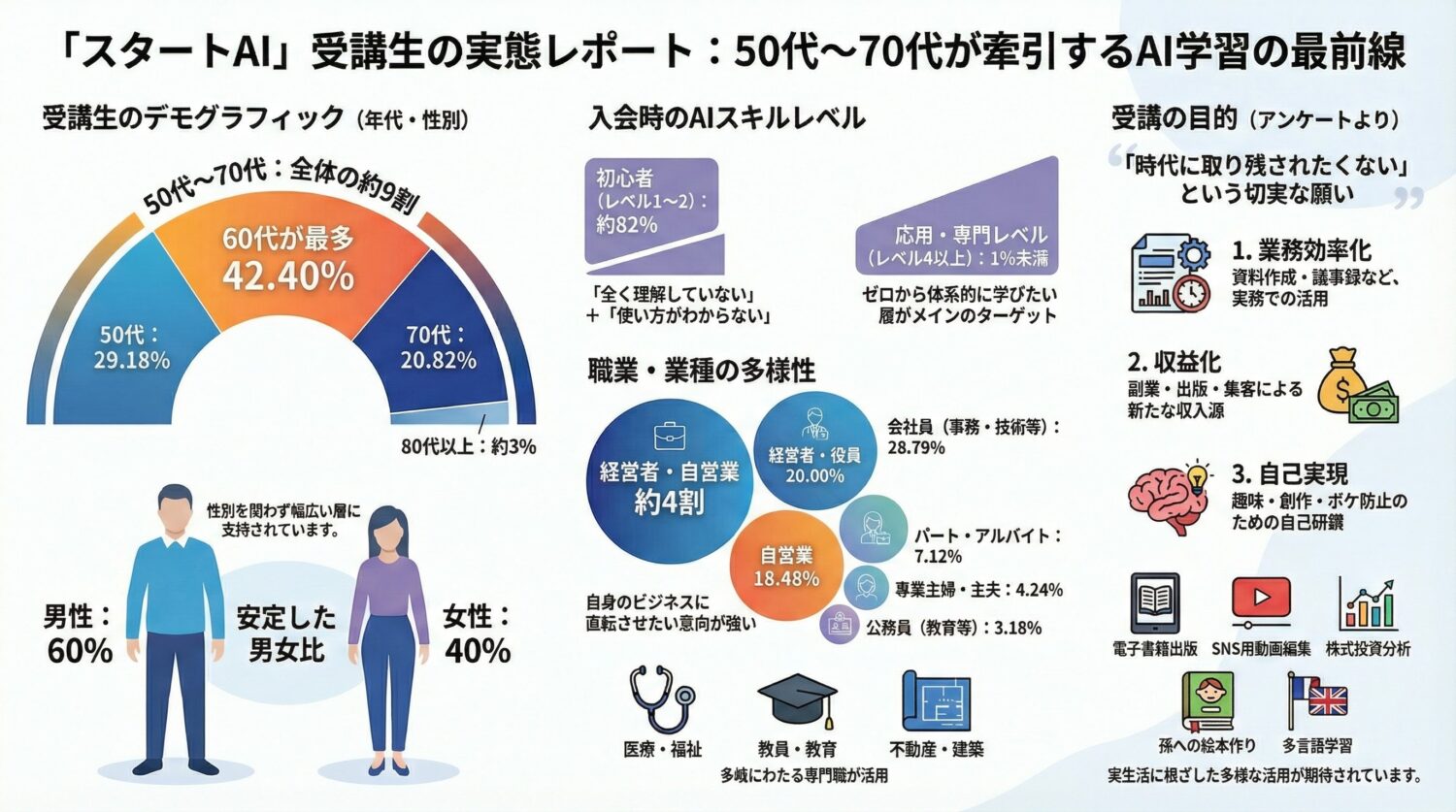 スタートAI運営元への独自取材により、受講者686人分のアンケートデータ、1,248人分のデモグラフィックデータ、受講生5人分の詳細インタビューを入手・使用しています。